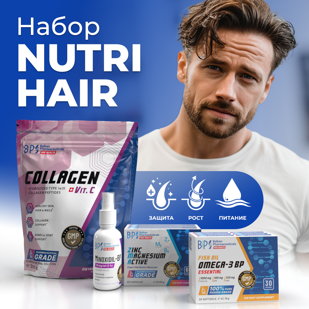 NUTRI HAIR для мужчин — это четырёхкомпонентная программа, которая работает изнутри и снаружи. Комбинация нутриентов, жирных кислот, коллагена и Миноксидила 5% воздействует на ключевые звенья, провоцирующие алопецию у мужчин.