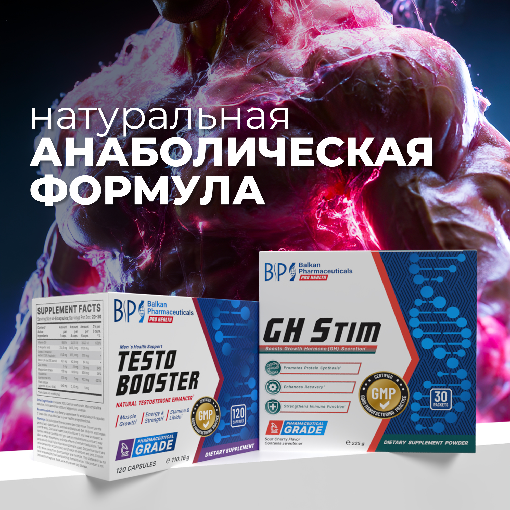 Комбинация двух мощных продуктов — TestoBooster и GH Stim — действует синергично: TestoBooster активизирует эндогенный тестостерон, повышает выносливость, силу и либидо, а GH Stim стимулирует секрецию гормона роста, поддерживает мышечное восстановление и улучшает сон.
