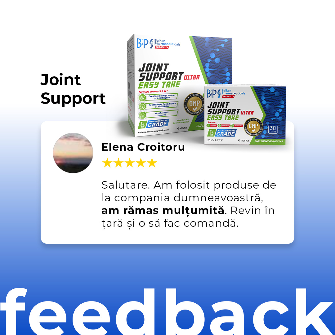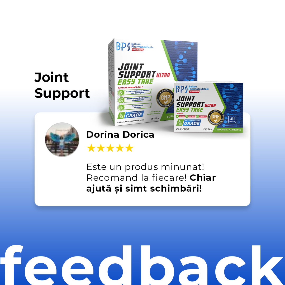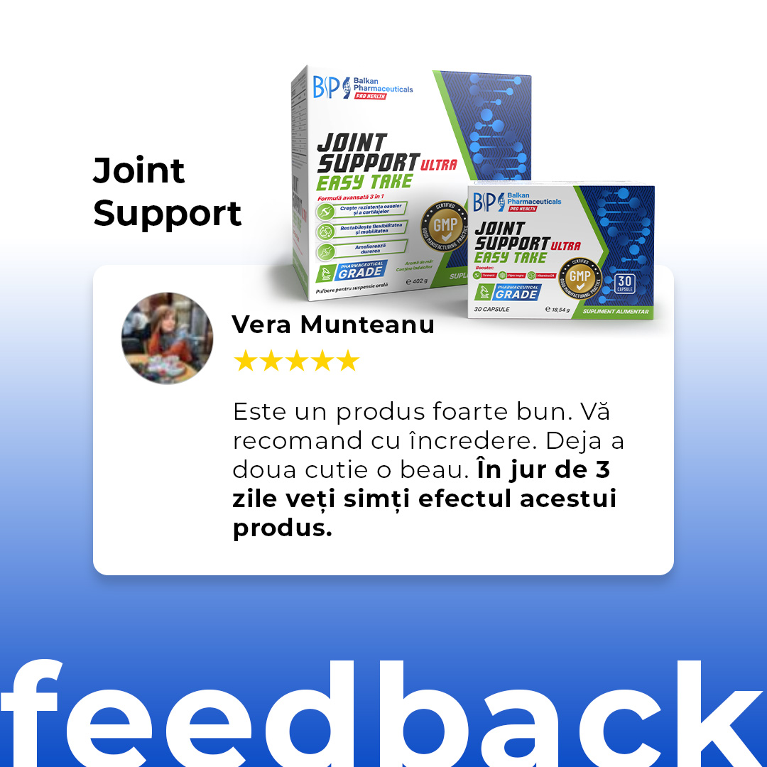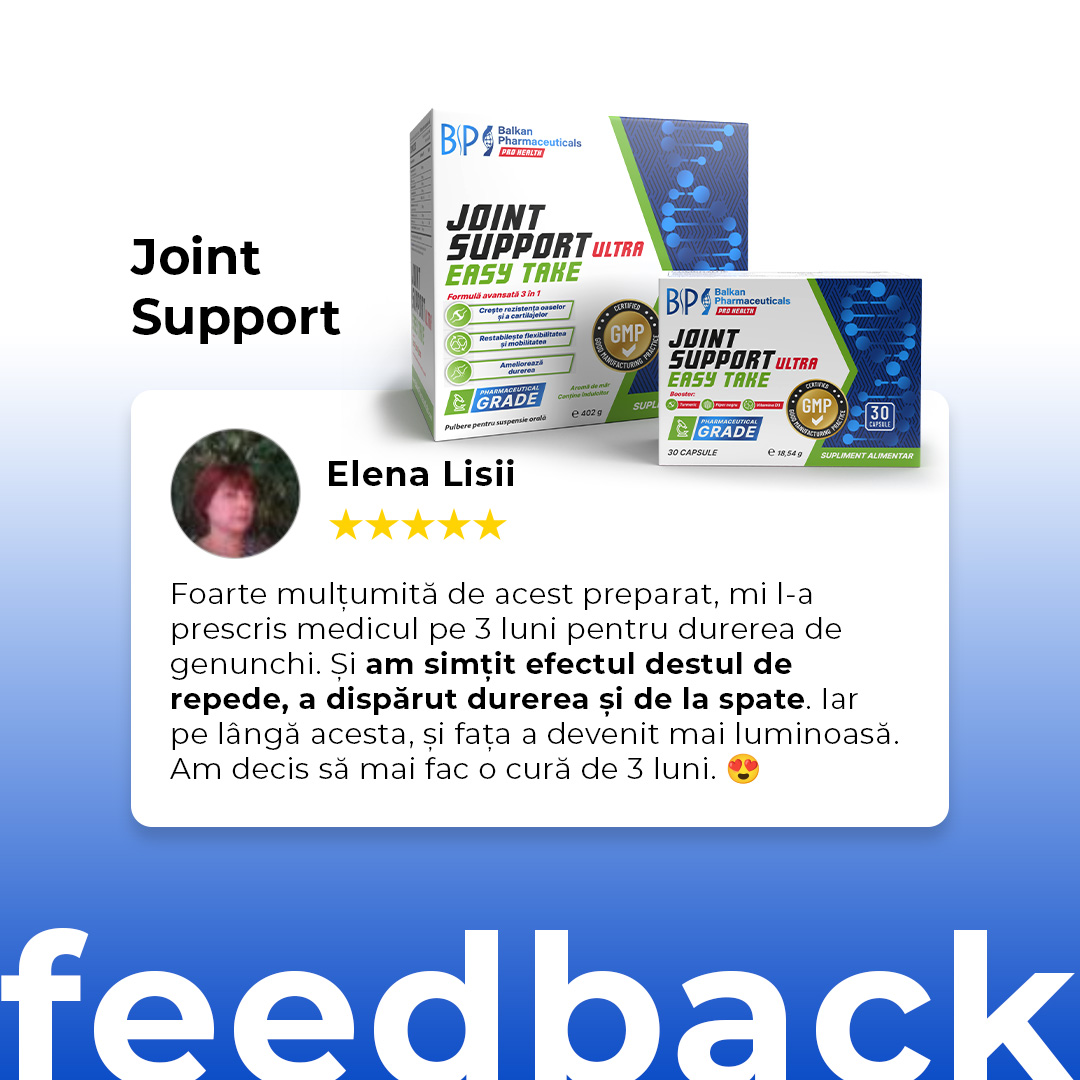 Suplimentul pentru articulații Balkan Pharmaceuticals oferă oamenilor activi o doză mare de 3000 mg de MSM, 300 mg de curcumină și 200 mg de boswellia, care, potrivit mai multor cercetări au un efect antiinflamator, reduc stresul oxidativ în organism și restabilesc flexibilitatea.