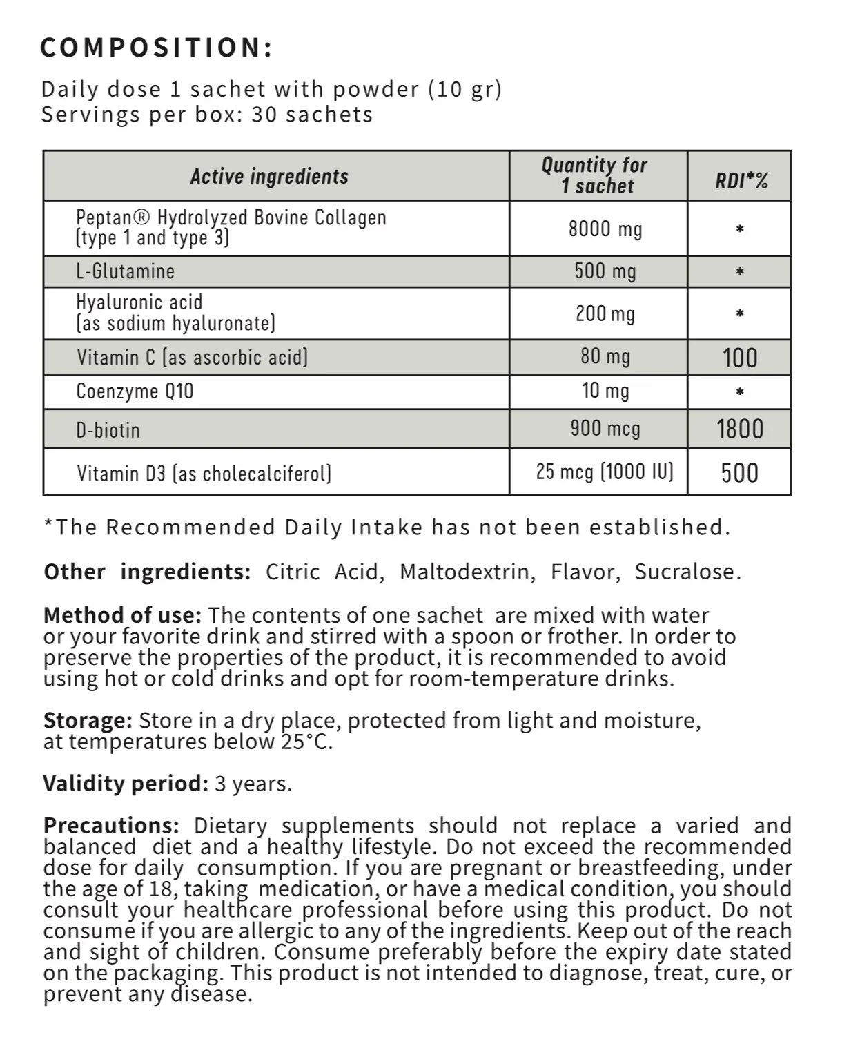 Formula cu colagen hidrolizat, acid hialuronic, coenzima Q10, vitaminele C și D3 și L-glutamina oferă nutriție profundă, hidratare și protecție împotriva semnelor de îmbătrânire.