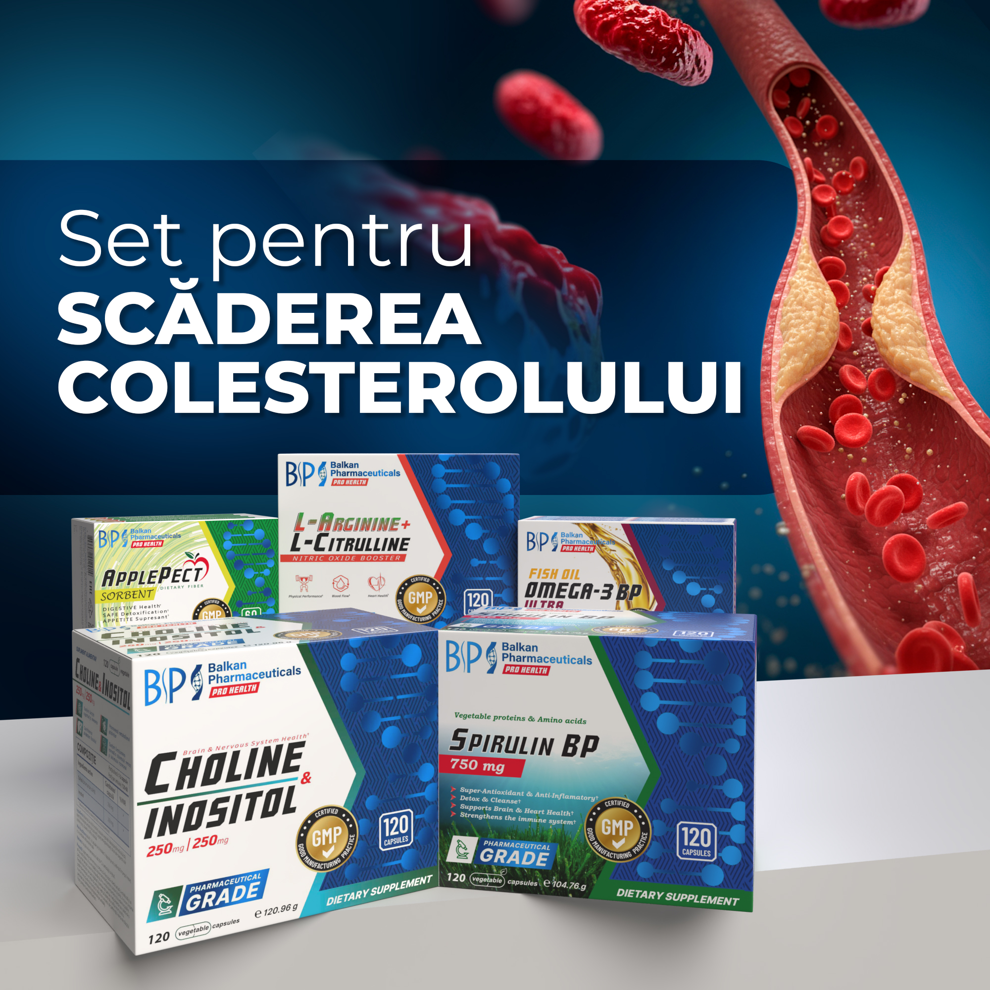 Combinația de Choline & Inositol, Apple Pect, Omega-3, L-Arginine + L-Citrulline și Spirulin BP reduce natural colesterolul, îmbunătățește circulația și crește vitalitatea. Recomandat persoanelor cu colesterol ridicat, stil de viață sedentar, stres sau alimentație dezechilibrată.